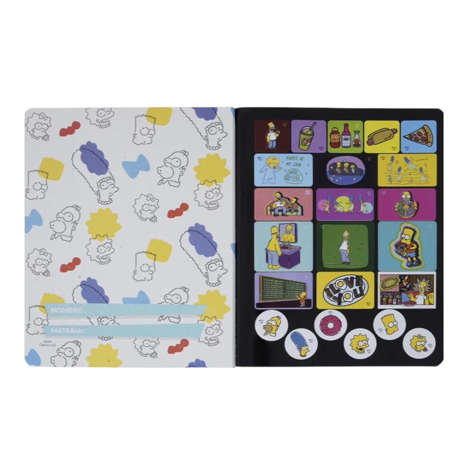 Son hechos con hilos de fibra de alta resistencia que evita que las hojas se desprendan. Las carátulas son de cartón grueso para evitar que se doblen las puntas e incluyen una hoja de stickers y reversos personalizados con la temática de The Simpson.