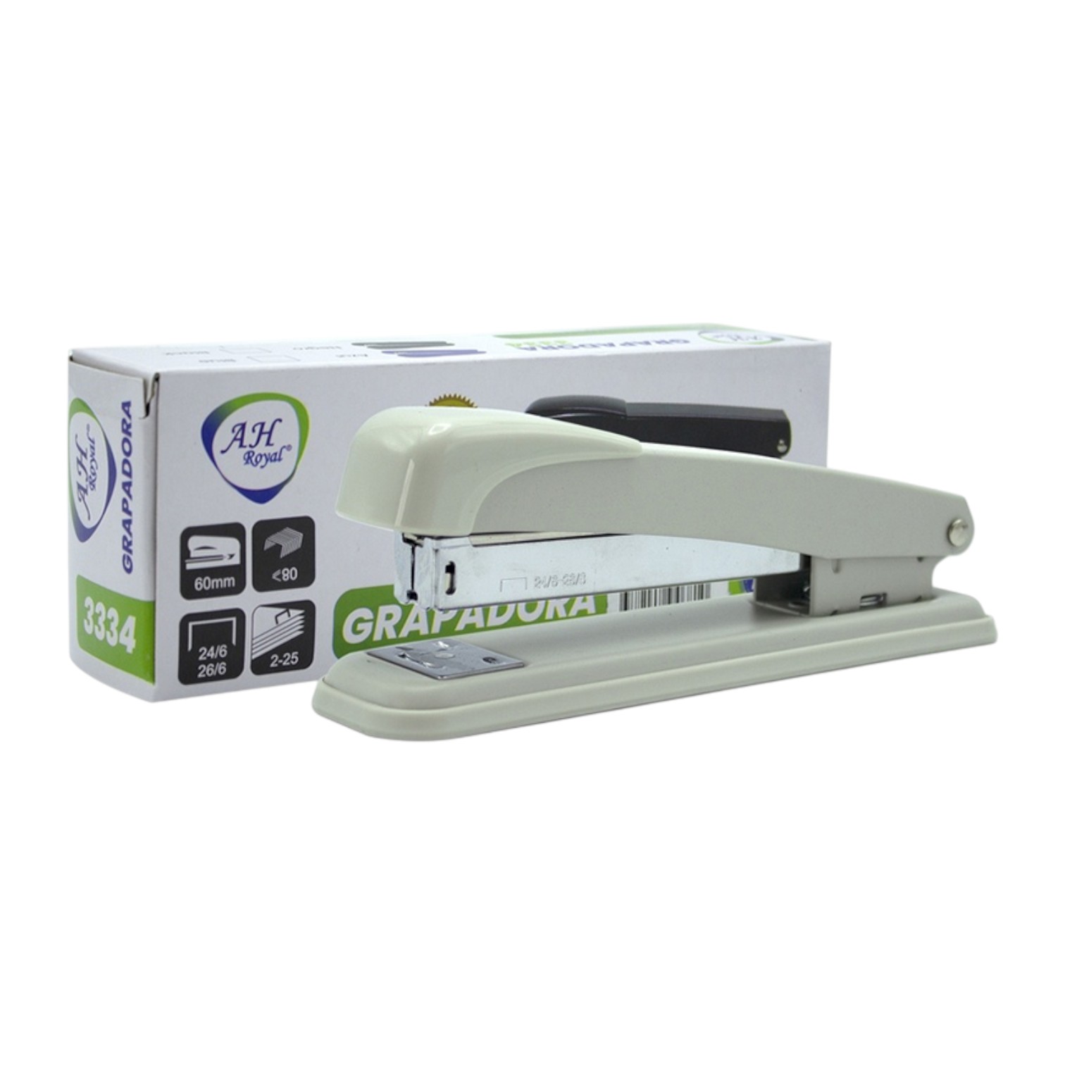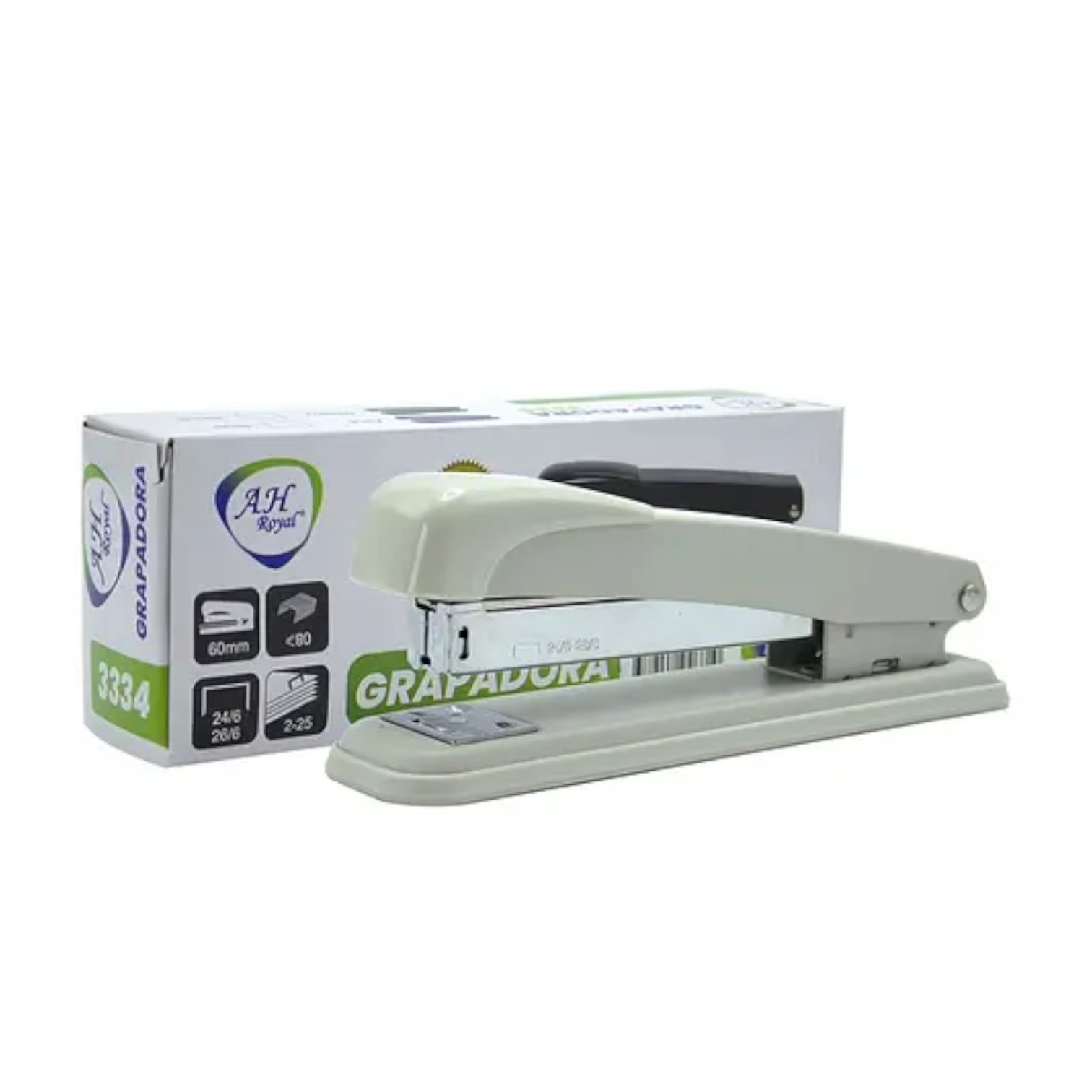Plástico resistente con base antideslizante y mecanismo metálico. Hasta 25 hojas de papel.