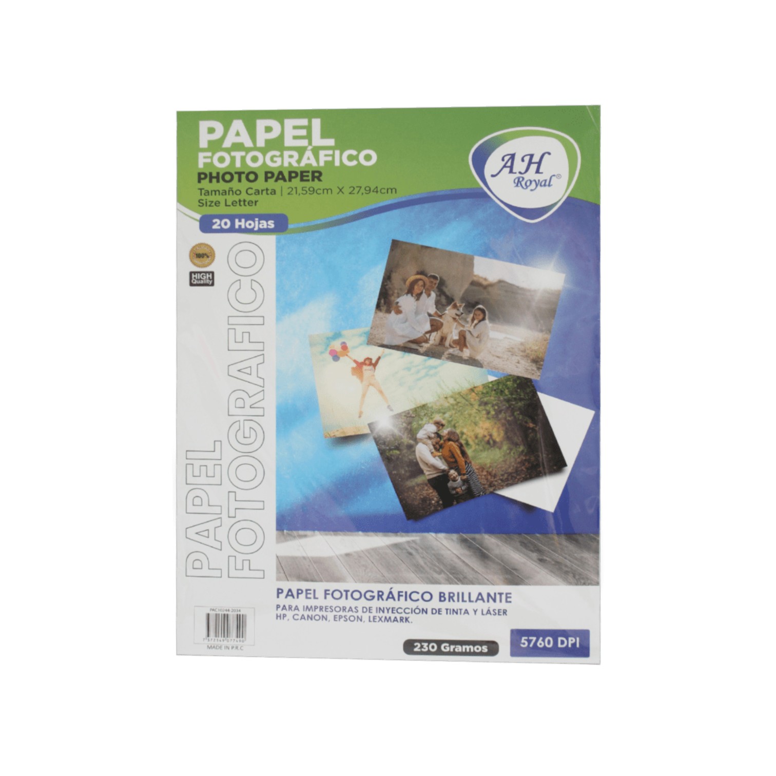 Papel Fotográfico tamaño Carta (21,59 cm x 27,94 cm). Gramaje de 230 gramos. Compatible con impresoras de inyección de tinta y láser. Resolución máxima de impresión de 5760 DPI.